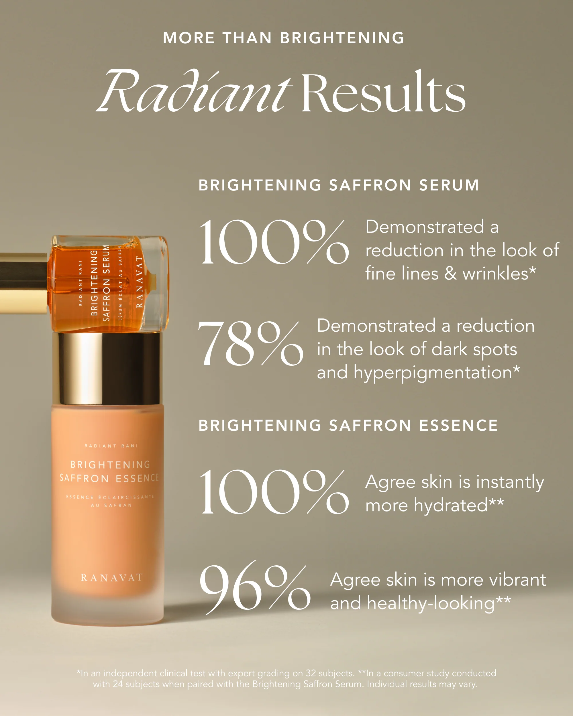 Brightening Saffron Essence Clinical Results: 82% Demonstrated a reduction in the look of dark spots and hyperpigmentation* *In an independent clinical study with 28 subjects after 28 days. Individual results may vary.