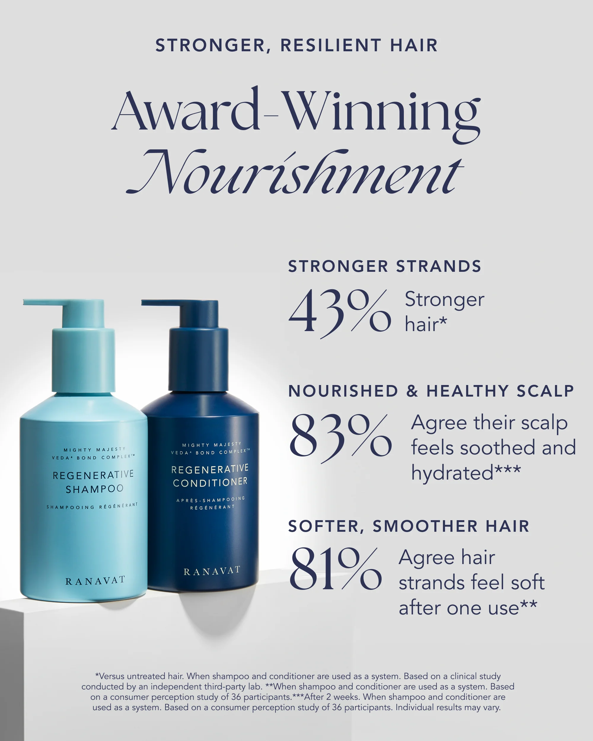 Our best-selling Regenerative Shampoo and Conditioner are designed to work in harmony as a two-step system to support a healthy scalp and nourished hair. The shampoo gently but deeply cleanses without sulfates. Follow with the silicone-free conditioner, which restores essential hydration and helps strengthen strands without buildup. Together, they deliver up to 43% stronger hair*. Both formulas are powered by our Veda4 Bond Complex, a blend of four powerful Ayurvedic adaptogens, for visibly resilient hair.