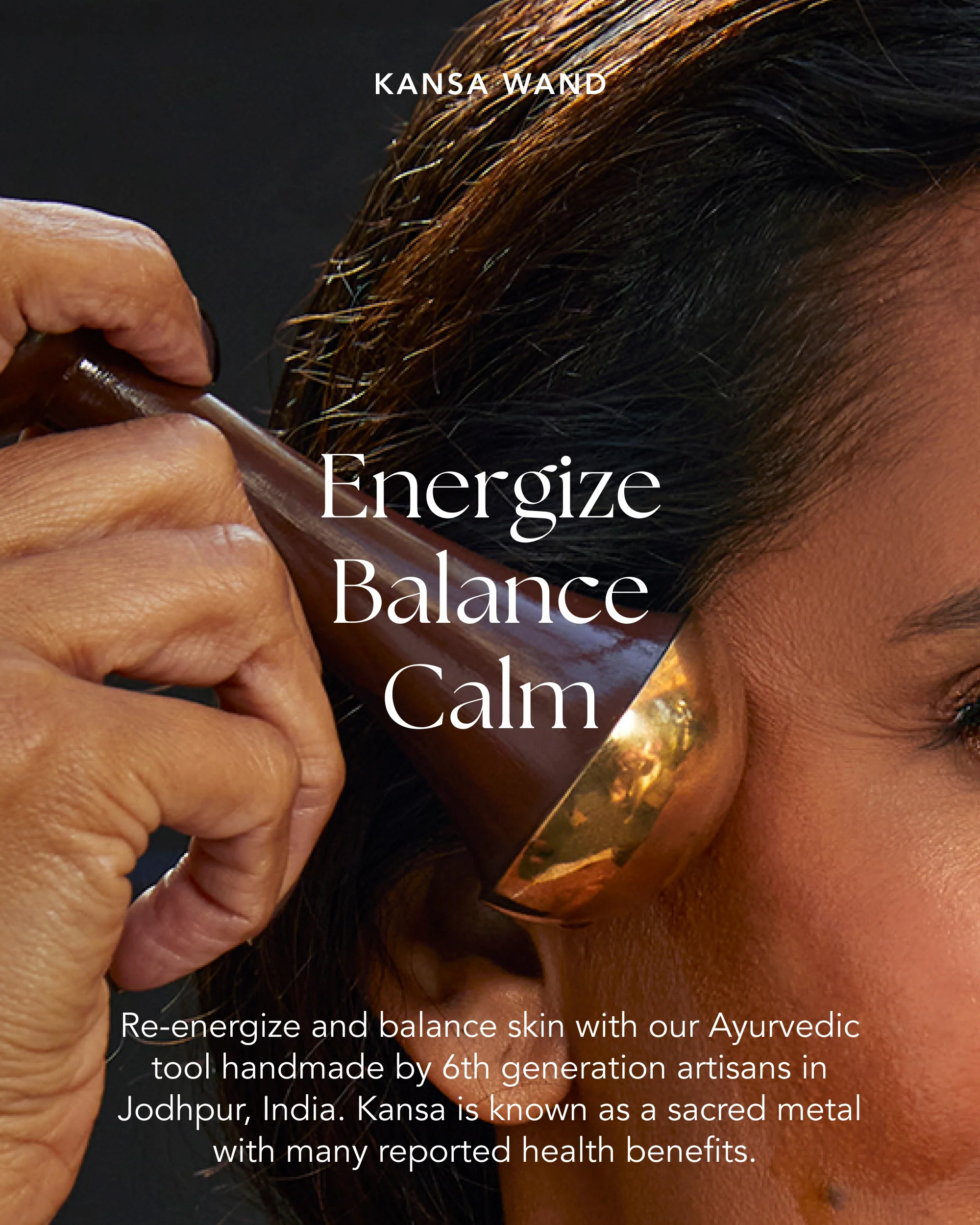 Re-energize your skin with pure Kansa, a sacred mix of copper and tin traditionally believed to balance and soothe the skin.Used by practitioners of Ayurveda for centuries, the pure Kansa balances skin’s pH to help calm irritation and redness. Use 2-3 times a week to help soften the look of lines and reveal your inner glow. Our Kansa Wand is handmade in Rajasthan, India, by 6th generation Kansa artisans. 100% teak wood handle with a base of pure Kansa (copper + tin).