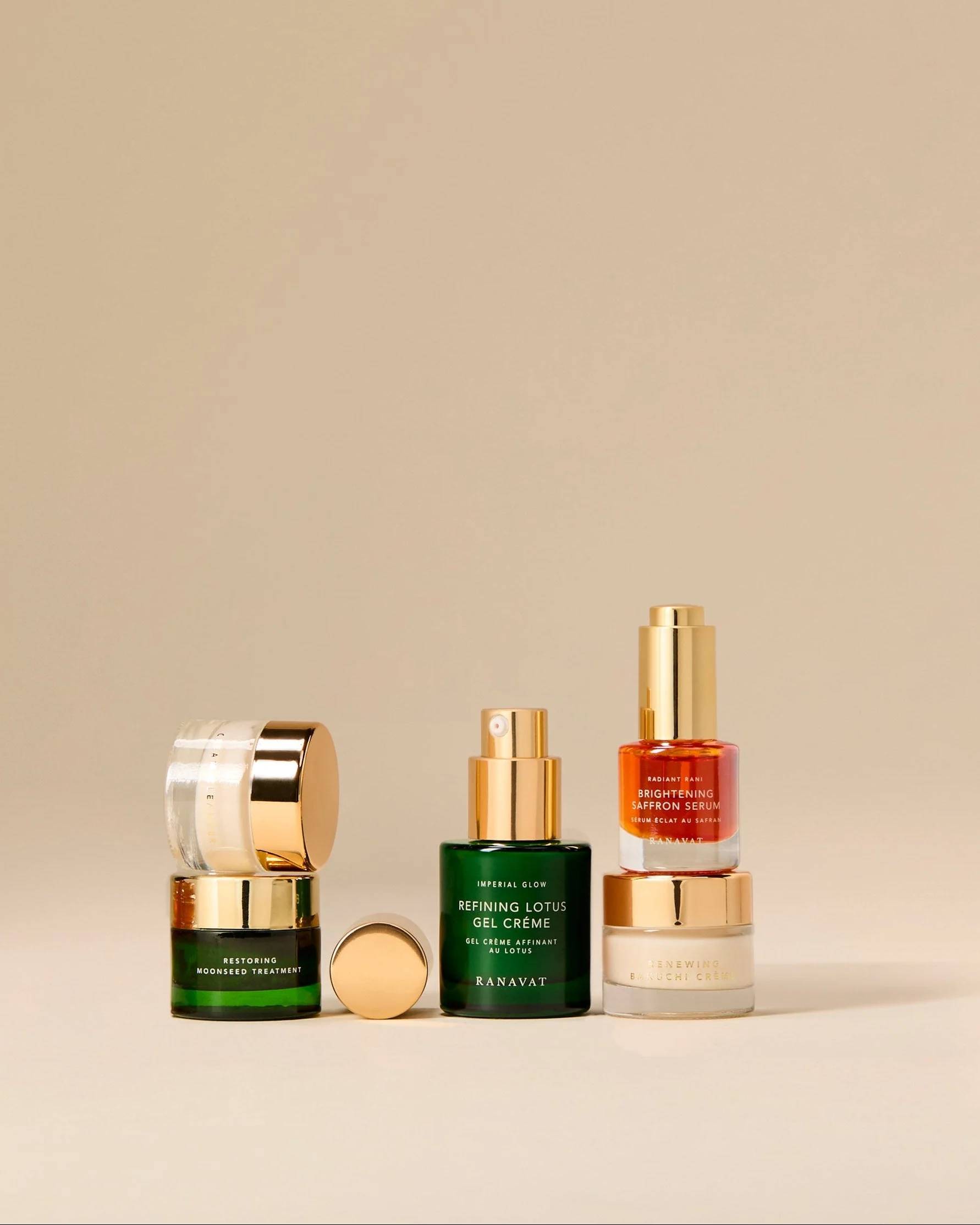 Set Includes: Cream Cleanser (8g), Brightening Saffron Serum (5mL), Renewing Bakuchi Crème (8g), Refining Lotus Gel Crème (15mL), Restoring Moonseed Treatment (8g).