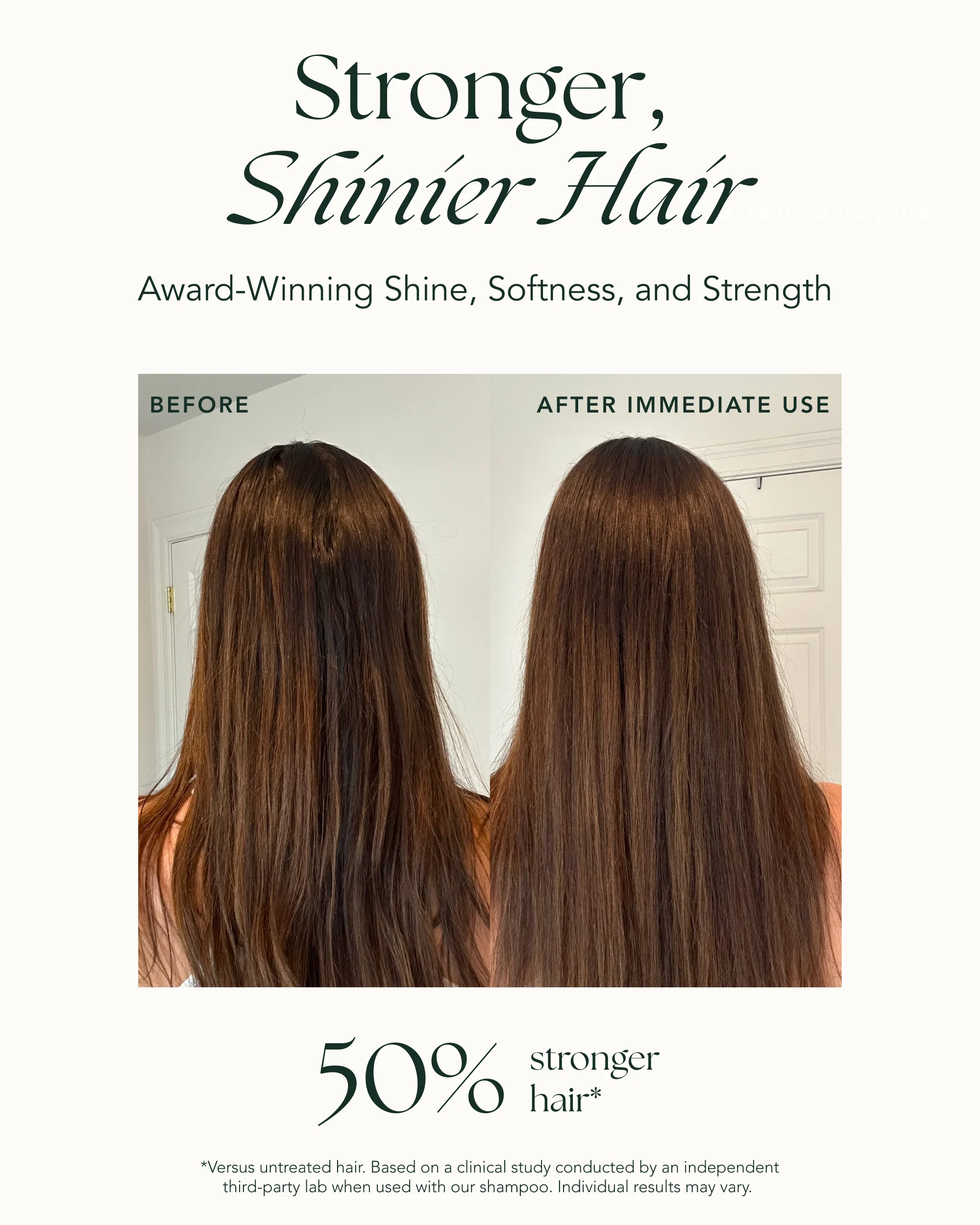 Fortifying Hair Serum Clinical Results: 50% Stronger hair* *Versus untreated hair. Based on a clinical study of the Fortifying Hair Serum conducted by an independent third-party lab when used with our shampoo. Individual results may vary.