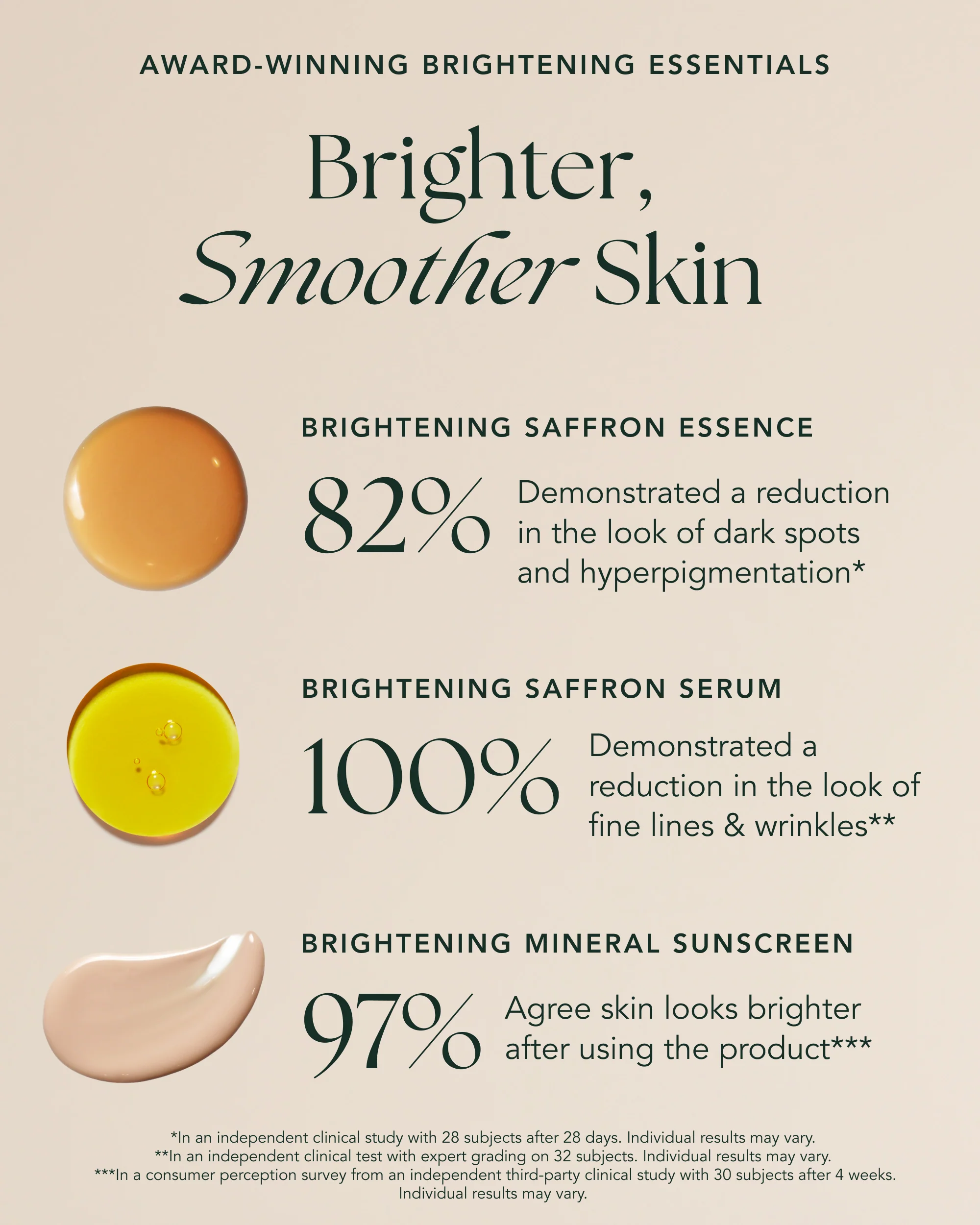 Brightening Saffron Serum Clinical Results: 100% Demonstrated a reduction in the look of fine lines & wrinkles** **In an independent clinical test with expert grading on 32 subjects. Individual results may vary.